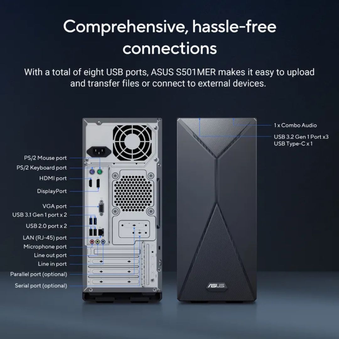 The ASUS S501MER Consumer Tower PC delivers next-level performance and reliability for both home and professional users. Powered by the Intel Core i5-14400, a 10-core hybrid processor, it ensures seamless multitasking, faster responsiveness, and smooth computing experiences.