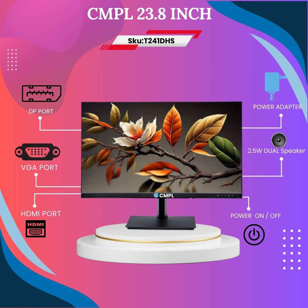 This 23.8" widescreen monitor features a frameless ultra-slim design and delivers full HD resolution at 1920x1080 pixels with a 75Hz refresh rate for smooth visuals. It boasts an A+ grade panel with a brightness range of 200-250 cd/m² and a dynamic contrast ratio of 500,000:1. The monitor is wall-mountable (4-hole design) and comes with a metallic stand that tilts (+15° forward, -5° backward). It supports HDMI and VGA inputs, making it suitable for both home and office use, including CCTV compatibility. The power consumption is efficient, running on a 12V/3A DC adapter. Bundled with an HDMI cable and DC adapter for quick setup, the monitor measures 15.3 x 54 x 38.7 cm, weighs 2.95 kg, and is covered by a 3-year warranty.