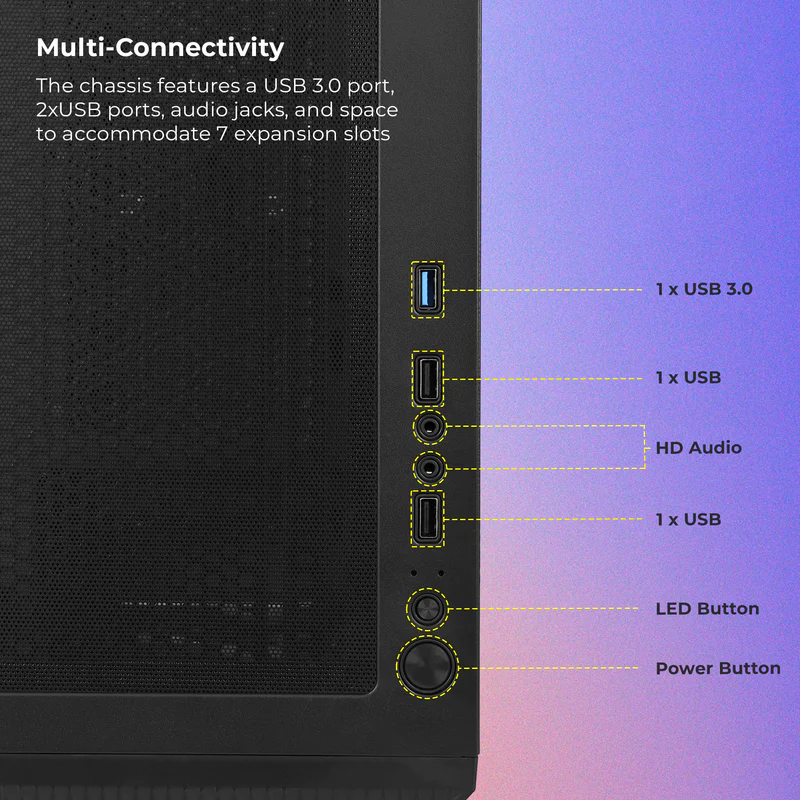 | Front I/O Ports | 1 x USB 3.0, 2 x USB 2.0, 1 x Audio, 1 x Mic |