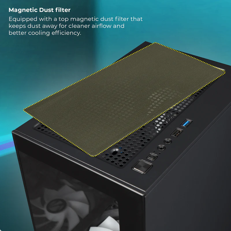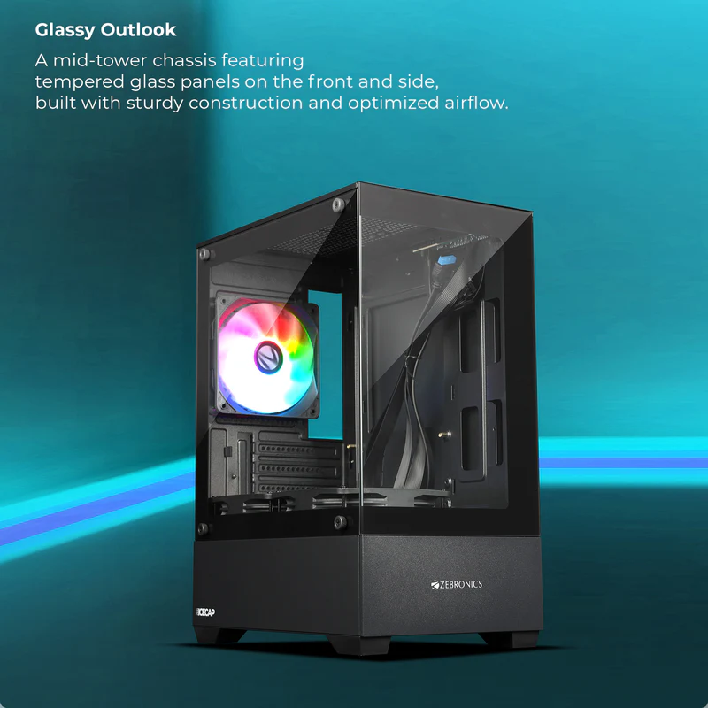 Experience the perfect combination of style, performance, and airflow with the Zebronics ZEB-ICECAP Mid-Tower Gaming Cabinet. Designed for gamers who want both aesthetics and cooling efficiency, this cabinet features a stunning ARGB illuminated front panel that brings your setup to life with vibrant lighting effects. The tempered glass side panel offers a clear view of your internal components, allowing you to proudly showcase your GPU, cooling system, and RGB hardware.