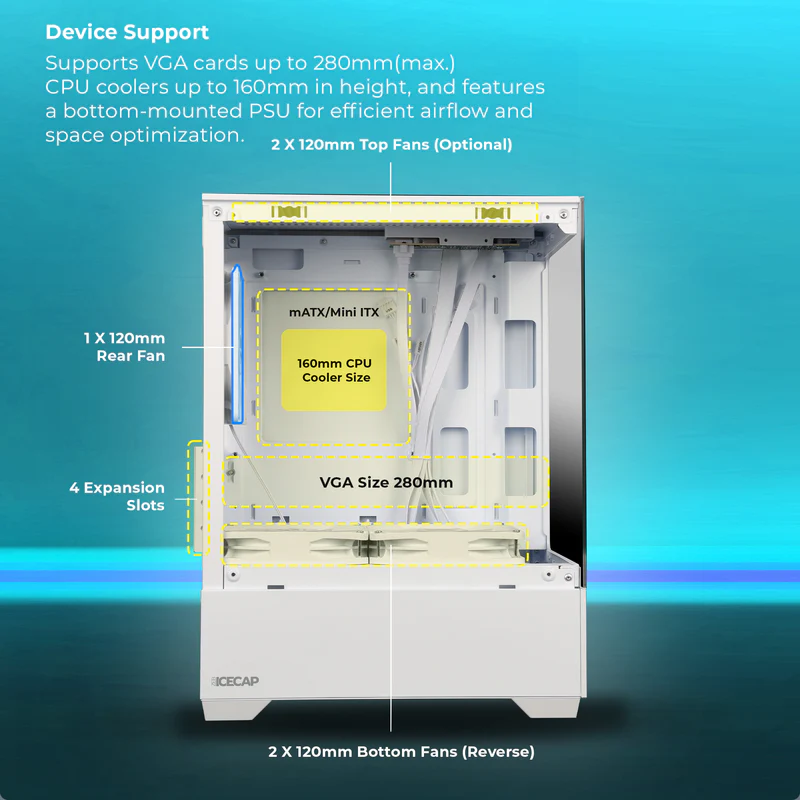 Built to support ATX, Micro-ATX, and Mini-ITX motherboards, the ZEB-ICECAP offers wide compatibility and flexibility for all types of PC builds — from entry-level systems to high-performance rigs. Its high-airflow chassis layout ensures optimized cooling, with multiple mounting options for additional fans or liquid cooling solutions, helping maintain stable performance even during long gaming sessions.