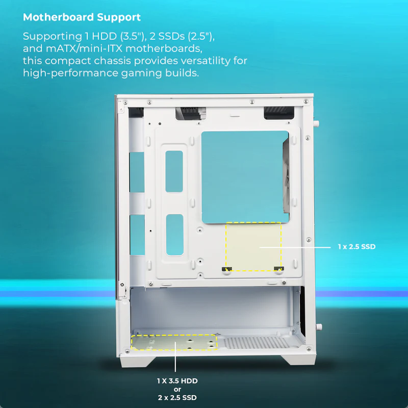 With bottom PSU placement, the cabinet delivers improved heat dissipation and neat cable management for a clean and efficient build. Plus, support for both SSD and HDD storage gives you the freedom to expand without compromise.