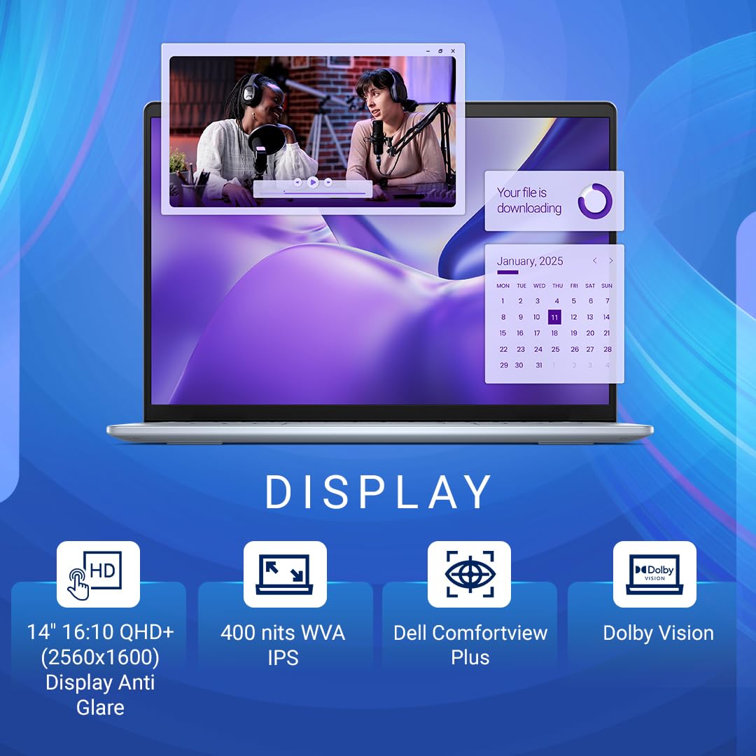[1] Recall is optimized for select languages (English, Chinese (simplified), French, German, Japanese, and Spanish). Content-based and storage limitations apply.[2] Cocreator is optimized for English text prompts. Requires Microsoft account.[3] Based on Inspiron 14 Plus (7441) tested with Snapdragon X Plus, X1P-64-100, QHD+ Touch Display, 16GB, 512GB SSD. Testing conducted by Dell labs in April 2024 using the Microsoft Movies & TV App, with display brightness set to 150 Nits and wireless enabled, battery life may be significantly less than the test results and varies depending on product configuration and use, software, usage, operating conditions, power management settings and other factors. Tested configurations may not be available in all regions/countries at all times. Maximum battery life will decrease with time.[4] Availability depends on local government regulation. For regions where Copilot is not available, pressing the Copilot key will bring up the Windows search menu.