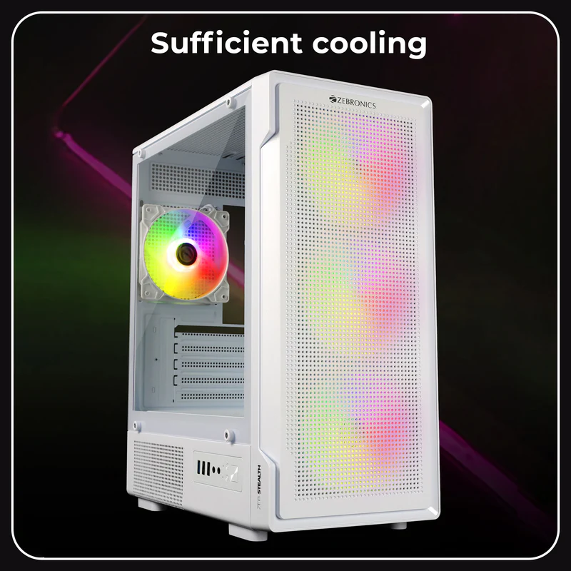 The Zebronics Zeb Stealth is a stylish and compact mini-tower gaming chassis designed for performance-focused mATX and Mini ITX builds. It comes equipped with four ARGB fans (three in the front, one at the back) and a tempered glass side panel, providing both strong airflow and stunning visual appeal.